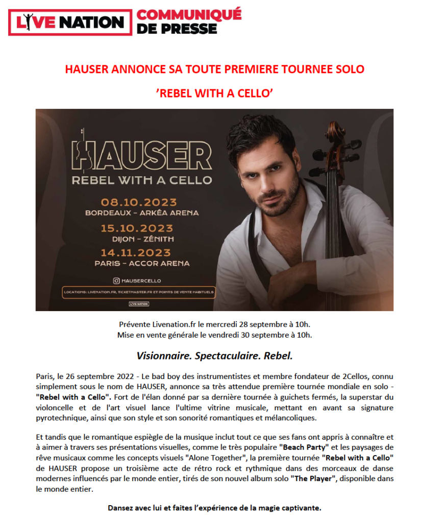 Accueil NEWS Hausser annonce sa toute première tournée solo : “Rebel With A Cello” NEWS Hausser annonce sa toute première tournée solo : “Rebel With A Cello” Par Pete Circle - 28 septembre 2022 0 FacebookTwitterPinterestWhatsApp TENDANCES Imminence prépare « The Black Finale » — concert unique à... NEWS 27 novembre 2025 XTRM Podcast du 27 novembre 2025 – Interview d’Imminence REPLAY 27 novembre 2025 💪 Rise of the Northstar fait résonner « A.I.R. Max »... NEWS 1 septembre 2025 XTRM Podcast du 26 novembre 2025 – Live Report METALEARTH SAMEDI... L'actu de Where The Promo Is 26 novembre 2025 XTRM Podcast du 25 novembre 2025 – Live Report THE INSPECTOR... LIVE REPORT 25 novembre 2025 @allrockmedia 815 Suiveurs Suivre