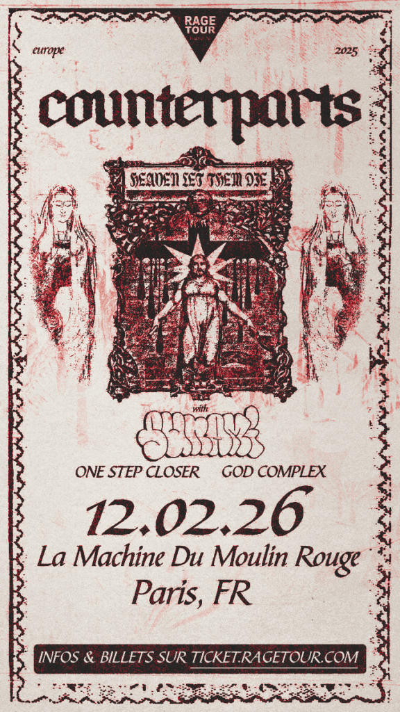 Trois ans après leur dernier passage à Paris, COUNTERPARTS signera son grand retour dans la capitale début 2026. Le rendez-vous est fixé au 12 février à La Machine du Moulin Rouge, pour une soirée qui s’annonce intense et sans détour. Les Canadiens seront accompagnés de Sunami, One Step Closer et God Complex – un line-up immanquable pour tous les fans de metalcore viscéral et mélodique.