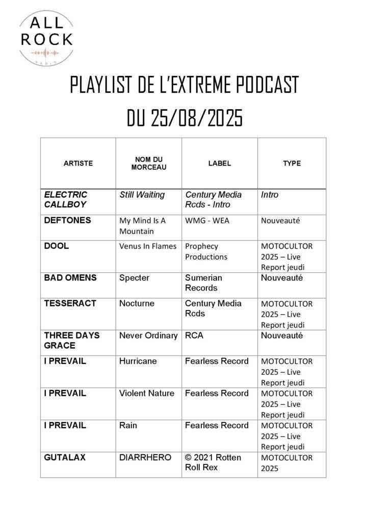 Accueil LIVE REPORT L’Extrême Podcast du 25 aout 2025 SPECIALE JEUDI DU MOTOCULTOR 2025 LIVE REPORTREPLAYTendance L’Extrême Podcast du 25 aout 2025 SPECIALE JEUDI DU MOTOCULTOR 2025 Par Pete Circle - 25 août 2025 0 FacebookTwitterPinterestWhatsApp /replay/20250825EP1.mp3 TENDANCES Imminence prépare « The Black Finale » — concert unique à... NEWS 27 novembre 2025 XTRM Podcast du 27 novembre 2025 – Interview d’Imminence REPLAY 27 novembre 2025 💪 Rise of the Northstar fait résonner « A.I.R. Max »... NEWS 1 septembre 2025 XTRM Podcast du 26 novembre 2025 – Live Report METALEARTH SAMEDI... L'actu de Where The Promo Is 26 novembre 2025 XTRM Podcast du 25 novembre 2025 – Live Report THE INSPECTOR... LIVE REPORT 25 novembre 2025 @allrockmedia 815 Suiveurs Suivre