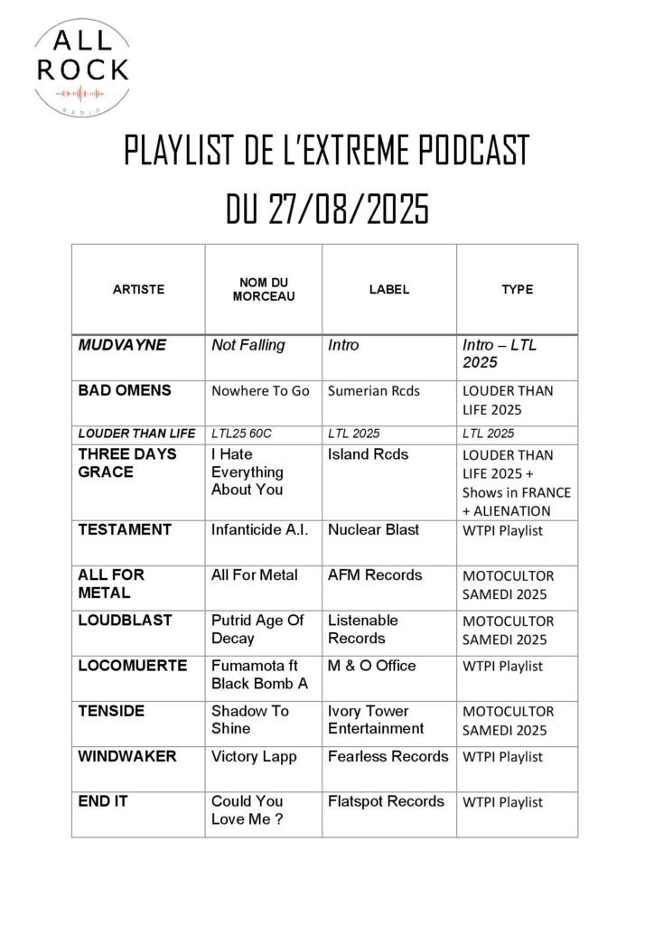 Accueil LIVE REPORT L’Extrême Podcast du 27 aout 2025 SPECIALE SAMEDI DU MOTOCULTOR 2025 +... LIVE REPORTREPLAYTendance L’Extrême Podcast du 27 aout 2025 SPECIALE SAMEDI DU MOTOCULTOR 2025 + WHERE THE PROMO IS PLAYLIST Par Pete Circle - 27 août 2025 0 FacebookTwitterPinterestWhatsApp Photos et leur insta : @gael_mathieu @romainballez @mademoiselle.chat /replay/20250827EP3.mp3 TENDANCES Imminence prépare « The Black Finale » — concert unique à... NEWS 27 novembre 2025 XTRM Podcast du 27 novembre 2025 – Interview d’Imminence REPLAY 27 novembre 2025 💪 Rise of the Northstar fait résonner « A.I.R. Max »... NEWS 1 septembre 2025 XTRM Podcast du 26 novembre 2025 – Live Report METALEARTH SAMEDI... L'actu de Where The Promo Is 26 novembre 2025 XTRM Podcast du 25 novembre 2025 – Live Report THE INSPECTOR... LIVE REPORT 25 novembre 2025 @allrockmedia 815 Suiveurs Suivre