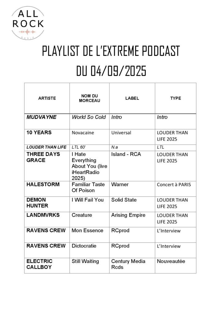 Accueil Playlist Playlist – L’Extrême Podcast du 4 septembre 2025 avec RAVENS CREW en... Playlist Playlist – L’Extrême Podcast du 4 septembre 2025 avec RAVENS CREW en interview Par Pete Circle - 4 septembre 2025 0 FacebookTwitterPinterestWhatsApp TENDANCES Imminence prépare « The Black Finale » — concert unique à... NEWS 27 novembre 2025 XTRM Podcast du 27 novembre 2025 – Interview d’Imminence REPLAY 27 novembre 2025 💪 Rise of the Northstar fait résonner « A.I.R. Max »... NEWS 1 septembre 2025 XTRM Podcast du 26 novembre 2025 – Live Report METALEARTH SAMEDI... L'actu de Where The Promo Is 26 novembre 2025 XTRM Podcast du 25 novembre 2025 – Live Report THE INSPECTOR... LIVE REPORT 25 novembre 2025 @allrockmedia 815 Suiveurs Suivre