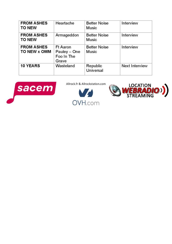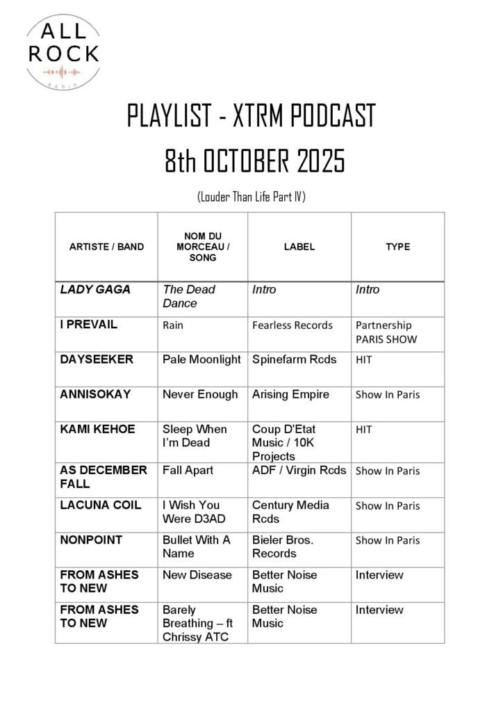 Accueil REPLAY XTRM Podcast du 8 octobre 2025 avec FROM ASHES TO NEW (Louder... REPLAYTendance XTRM Podcast du 8 octobre 2025 avec FROM ASHES TO NEW (Louder Than Life interviews) Par Pete Circle - 8 octobre 2025 0 FacebookTwitterPinterestWhatsApp /replay/20251008EP9.mp3 TENDANCES Imminence prépare « The Black Finale » — concert unique à... NEWS 27 novembre 2025 XTRM Podcast du 27 novembre 2025 – Interview d’Imminence REPLAY 27 novembre 2025 💪 Rise of the Northstar fait résonner « A.I.R. Max »... NEWS 1 septembre 2025 XTRM Podcast du 26 novembre 2025 – Live Report METALEARTH SAMEDI... L'actu de Where The Promo Is 26 novembre 2025 XTRM Podcast du 25 novembre 2025 – Live Report THE INSPECTOR... LIVE REPORT 25 novembre 2025 @allrockmedia 815 Suiveurs Suivre