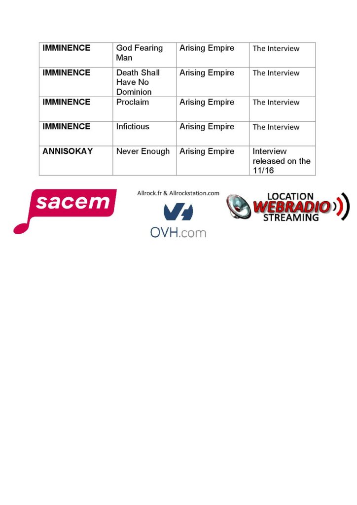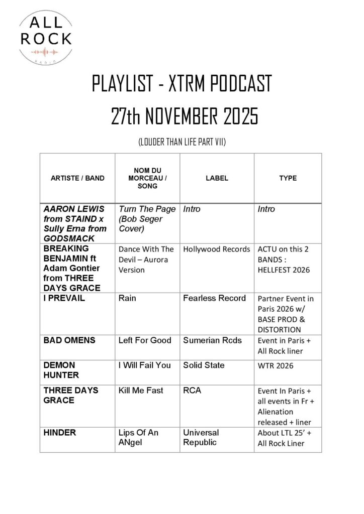 Accueil REPLAY XTRM Podcast du 27 novembre 2025 – Interview d’Imminence REPLAYTendance XTRM Podcast du 27 novembre 2025 – Interview d’Imminence Par Pete Circle - 27 novembre 2025 0 FacebookTwitterPinterestWhatsApp /replay/20251127EP20.mp3 TENDANCES Imminence prépare « The Black Finale » — concert unique à... NEWS 27 novembre 2025 💪 Rise of the Northstar fait résonner « A.I.R. Max »... NEWS 1 septembre 2025 XTRM Podcast du 26 novembre 2025 – Live Report METALEARTH SAMEDI... L'actu de Where The Promo Is 26 novembre 2025 XTRM Podcast du 25 novembre 2025 – Live Report THE INSPECTOR... LIVE REPORT 25 novembre 2025 Bad Omens : nouveau single « Left For Good », clip... NEWS 20 novembre 2025 @allrockmedia 815 Suiveurs Suivre