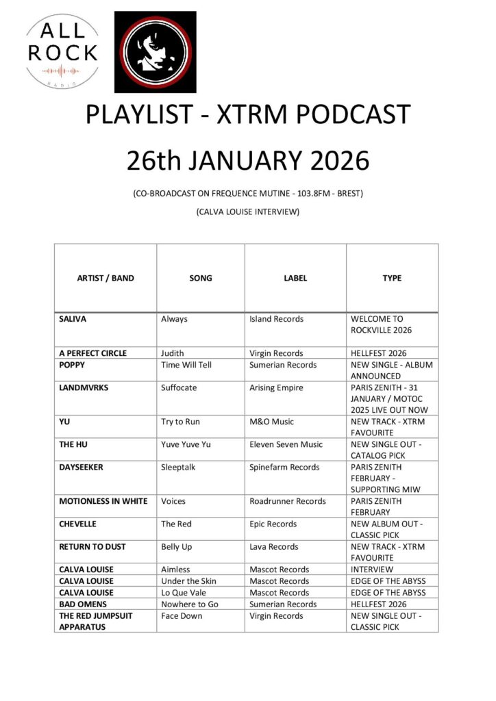 Accueil FREQUENCE MUTINE XTRM Podcast du 26 janvier 2026 avec CALVA LOUISE en interview –... FREQUENCE MUTINEREPLAYTendance XTRM Podcast du 26 janvier 2026 avec CALVA LOUISE en interview – Fréquence Mutine 103.8 FM Brest Par Pete Circle - 26 janvier 2026 0 FacebookTwitterPinterestWhatsApp TENDANCES MIDEM 2026 : Sharon Osbourne et Andy Copping invités de marque... NEWS 18 janvier 2026 XTRM Podcast du 19 janvier 2026 – Fréquence Mutine – SPECIALE... FREQUENCE MUTINE 19 janvier 2026 BLACK LABEL SOCIETY : “Engines of Demolition” sort le 27 mars... NEWS 18 janvier 2026 Austin Carlile est de retour en 2026 avec “Twisted” (clip officiel) NEWS 18 janvier 2026 XTRM Podcast du 12 janvier 2026 – Fréquence Mutine première en... FREQUENCE MUTINE 12 janvier 2026 @allrockmedia 815 Suiveurs Suivre
