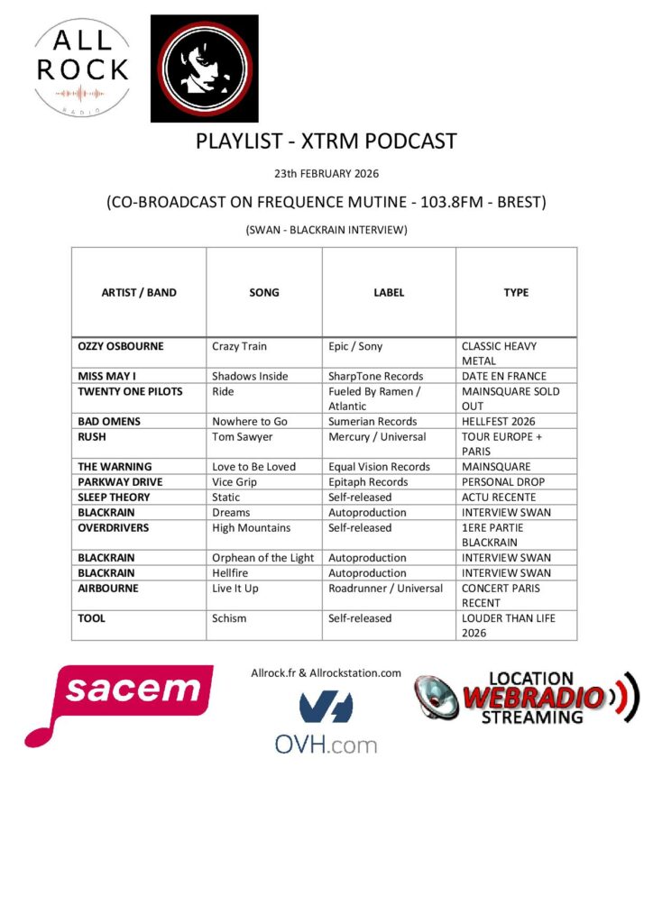 Dans cette émission, on ouvre avec un classique du heavy metal : Ozzy Osbourne – “Crazy Train”, suivi par Miss May I – “Shadows Inside”, fraîchement diffusé en France. L’énergie reste intense avec Twenty One Pilots – “Ride”, tandis que Bad Omens – “Nowhere to Go” marque un clin d’œil au Hellfest 2026. Place aux légendes progressives avec Rush – “Tom Sawyer”, en route pour leur tournée européenne et un passage à Paris. Festival vibes avec The Warning – “Love to Be Loved”, qui sera aussi au Mainsquare. Le hardcore et le metal moderne s’installent avec Parkway Drive – “Vice Grip”, choix personnel, et Sleep Theory – “Static”, récent et chargé d’actualité. Gros focus local et interviews avec Blackrain : “Dreams”, “Orphean of the Light” et “Hellfire”, et leur première partie Overdrivers – “High Mountains”. On termine sur du live rock énergique avec Airbourne – “Live It Up”, et Tool – “Schism”, pour annoncer le Louder Than Life 2026. Une émission qui mêle classiques, nouveautés, festivals et exclusivités, pour un panorama complet du rock et du metal.