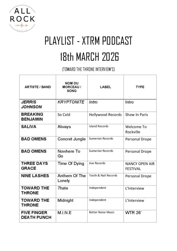 Accueil Playlist Playlist – XTRM Podcast du 18 mars 2026 – Interview avec Thoward... Playlist Playlist – XTRM Podcast du 18 mars 2026 – Interview avec Thoward The Throne Par Pete Circle - 22 mars 2026 0 FacebookTwitterPinterestWhatsApp TENDANCES XTRM Podcast du 26 mars 2026 avec PERFECTO – Fréquence Mutine... FREQUENCE MUTINE 23 mars 2026 XTRM Podcast du 16 mars 2026 avec SAINT AGNES + ASHEN... FREQUENCE MUTINE 16 mars 2026 XTRM Podcast du 9 mars 2026 avec MYRATH – Fréquence Mutine... Playlist 9 mars 2026 XTRM Podcast du 2 mars 2026 avec Yù – Fréquence Mutine... FREQUENCE MUTINE 2 mars 2026 XTRM Podcast du 23 février 2026 avec Swan de BLACKRAIN en... FREQUENCE MUTINE 24 février 2026