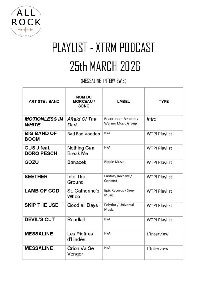 Accueil NEWS L'actu de Where The Promo Is XTRM Podcast du 25 mars 2026 – Interview avec MESSALINE NEWSL'actu de Where The Promo IsREPLAY XTRM Podcast du 25 mars 2026 – Interview avec MESSALINE Par Pete Circle - 29 mars 2026 0 FacebookTwitterPinterestWhatsApp /replay/20260329EP23.mp3 TENDANCES XTRM Podcast du 26 mars 2026 avec PERFECTO – Fréquence Mutine... FREQUENCE MUTINE 23 mars 2026 XTRM Podcast du 16 mars 2026 avec SAINT AGNES + ASHEN... FREQUENCE MUTINE 16 mars 2026 XTRM Podcast du 9 mars 2026 avec MYRATH – Fréquence Mutine... Playlist 9 mars 2026 XTRM Podcast du 2 mars 2026 avec Yù – Fréquence Mutine... FREQUENCE MUTINE 2 mars 2026 XTRM Podcast du 23 février 2026 avec Swan de BLACKRAIN en... FREQUENCE MUTINE 24 février 2026